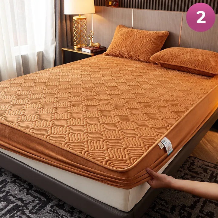 Fitted Size Washable Thicken Quilted Velvet Solid Color Mattress Bedsheet + 2 Pillow Case