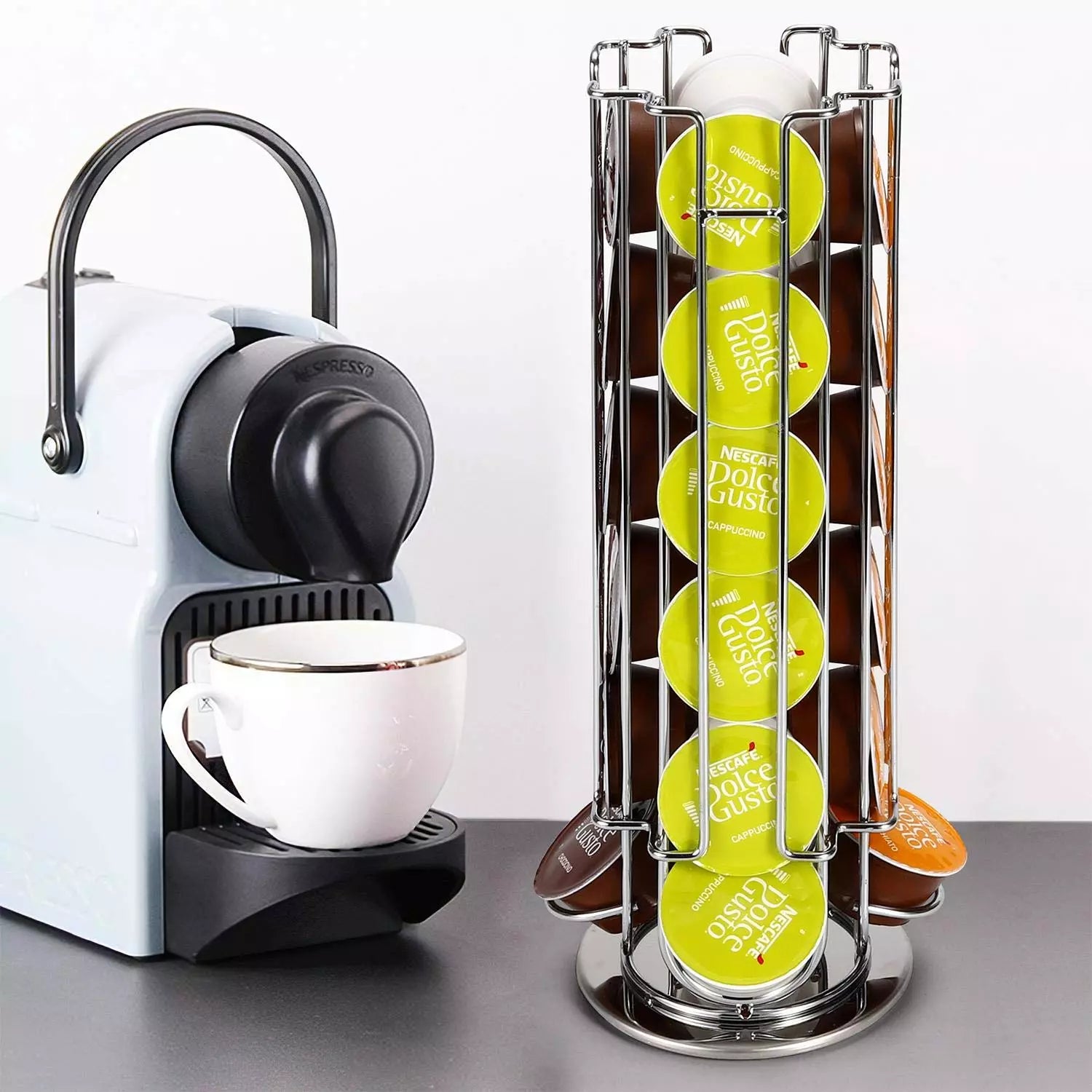 24 Coffee Pod Holder – Rotating Chrome Tower Storage Stand for Coffee Capsules