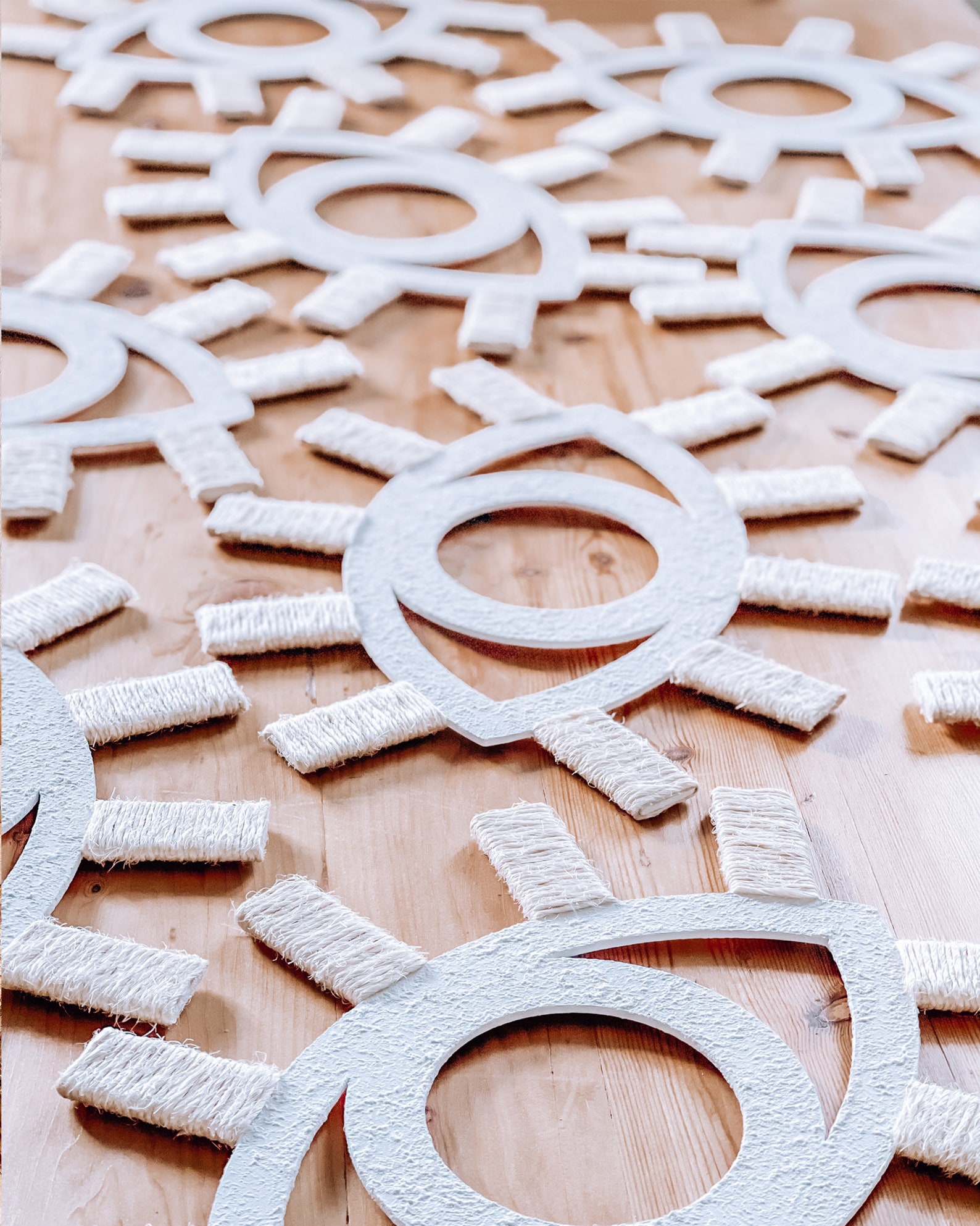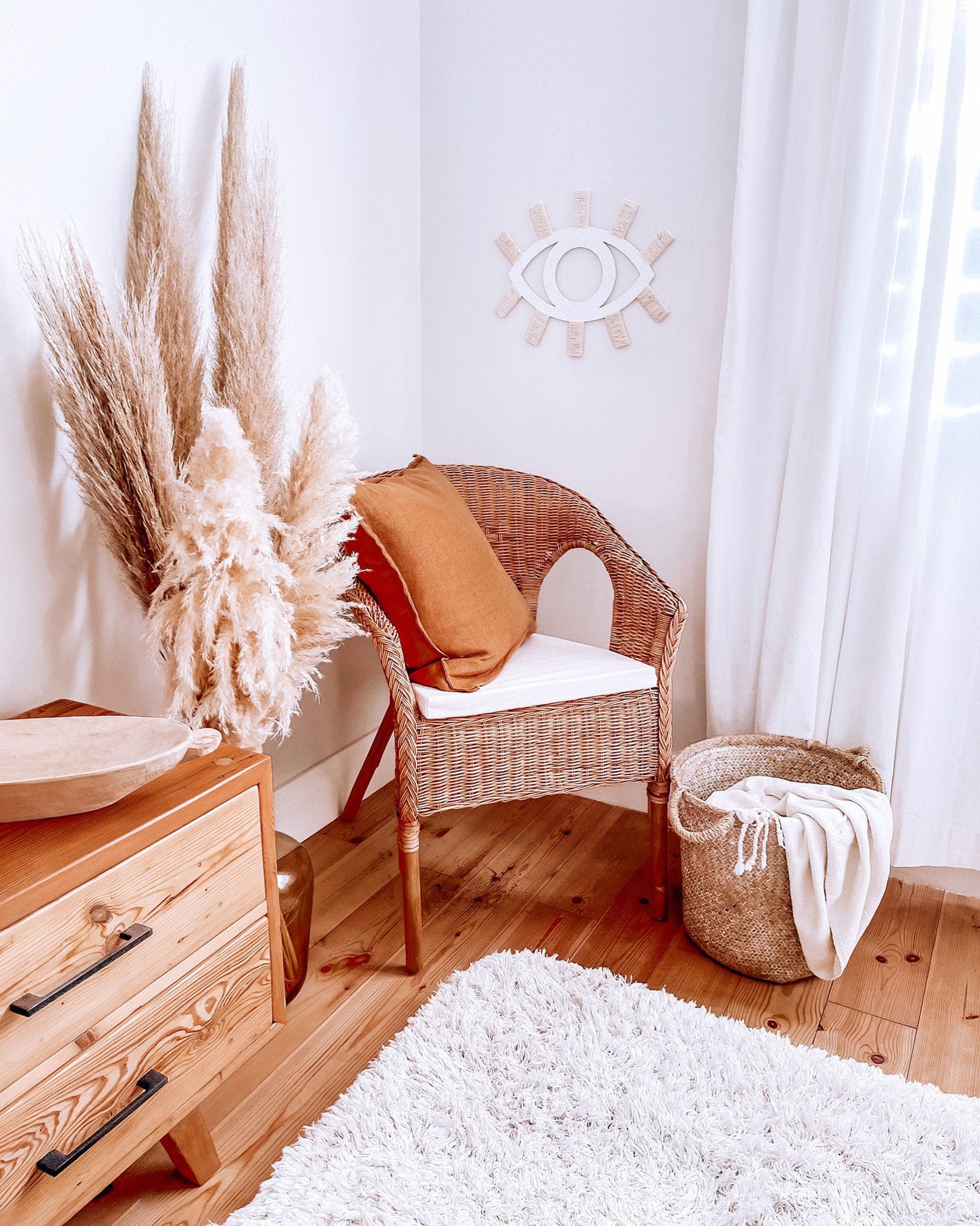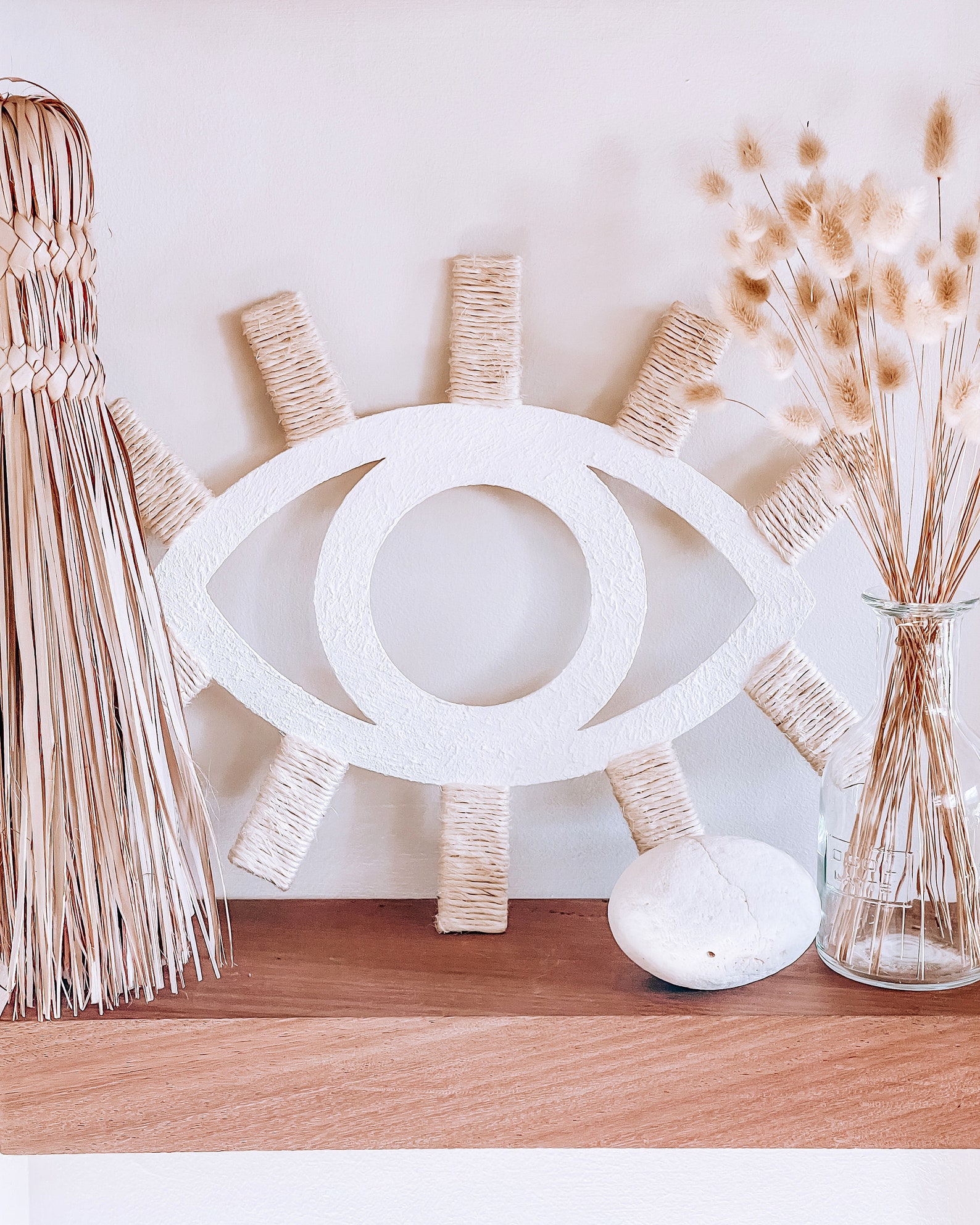 This neutral toned wooden piece has been hand-painted using a textured white paint, and finished with natural sisal twine wrapped lashes for a modern twist on the original (traditionally blue) talisman.